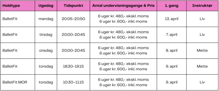 BalletFit | tirsdag | 20:00-20:45 | 6 uger kr. 480,- ekskl. moms 6 uger kr. 600,- inkl. moms | 7. april | Liv |